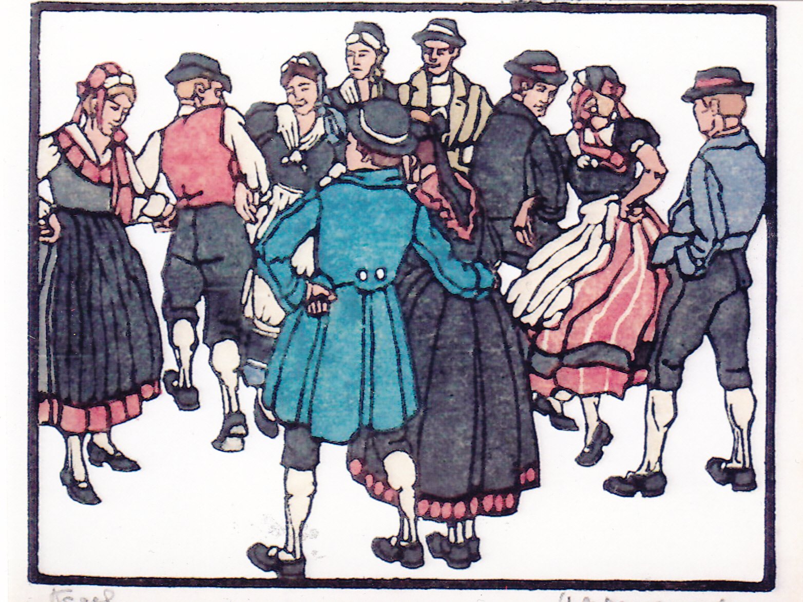 Bergenroth KEGELUnter den Materialien befindet sich auch ein Originaldruck des Malers und Illustrators Wolfgang Bergenroth (1893-1942), der vor allem durch genaue Darstellungen von Trachten, Trachtenzubehör und volkskundlichen Objekten bekannt wurde, die bis heute in zahlreichen Publikationen und Museumsausstellungen eine große Rolle spielen.Der farbige, 33 x 27 cm große Holzschnitt zeigt den sogenannten „Kegel“, einen alten mecklenburgischen Tanz. Das Bild war ein persönliches Geschenk des Künstlers an die erst 17jährige Mutter von Hans-Joachim Reuter, die damals einer Schweriner Volkstanzgruppe angehörte. Der „Kegel“ gehört nun zum Spezialarchiv Bauernhochschule Wiligrad des Schlossvereins.